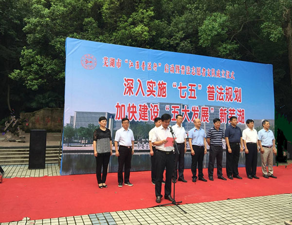 2017年6月27日上午,根据市法宣办、市委宣传部、市人大内司工委《关于印发<芜湖市2017年“江淮普法行”活动方案>的通知》统一部署,在赭山公园法治广场举行2017年“江淮普法行”启动暨普法志愿者支队成立仪式,市委、市人大、市政府、市政协领导现场检查指导,市中院、市检察院、市司法局等多个单位参与。