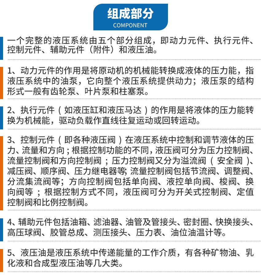 2.一个完整的液压系统由五个部分组成,即动力元件、执行元件、控制元件、辅助元件(附件)和液压油。