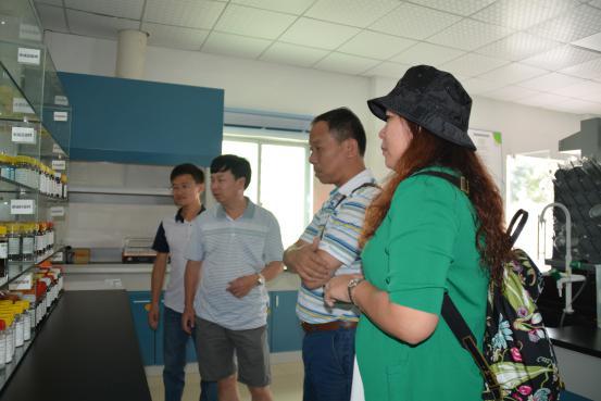 林明董事长一行(左3)参观质检中心留样区并了解我司质量管理追踪系统