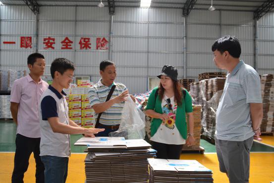 林明董事长(左3)参观乡喜液体肥使用的包材——纸箱+液袋